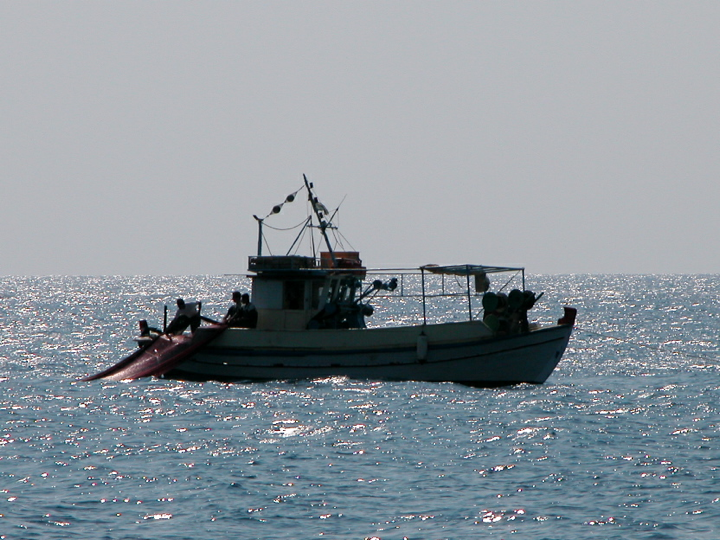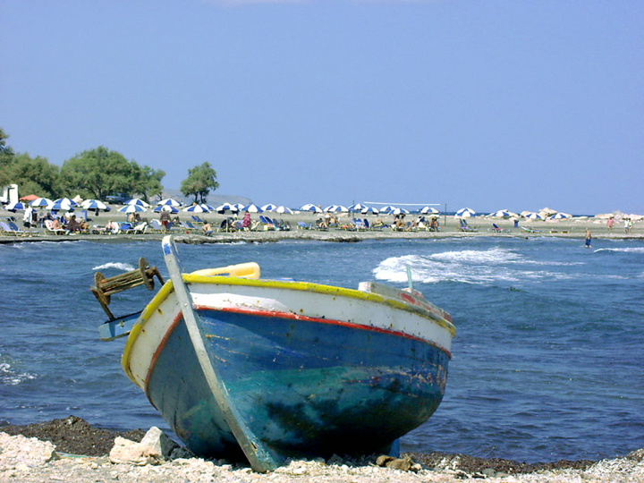 Santorini - A fishing boat off Perivolos beach
