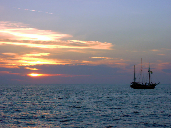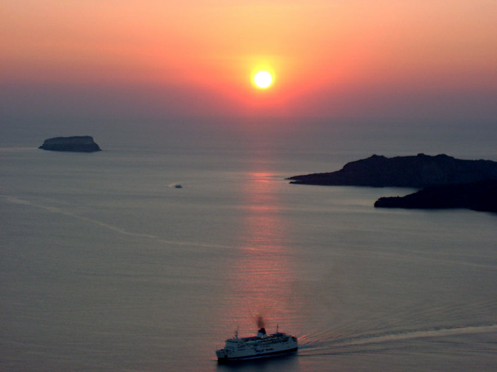 Santorini - Cruise boat amidst sunset-drenched waters