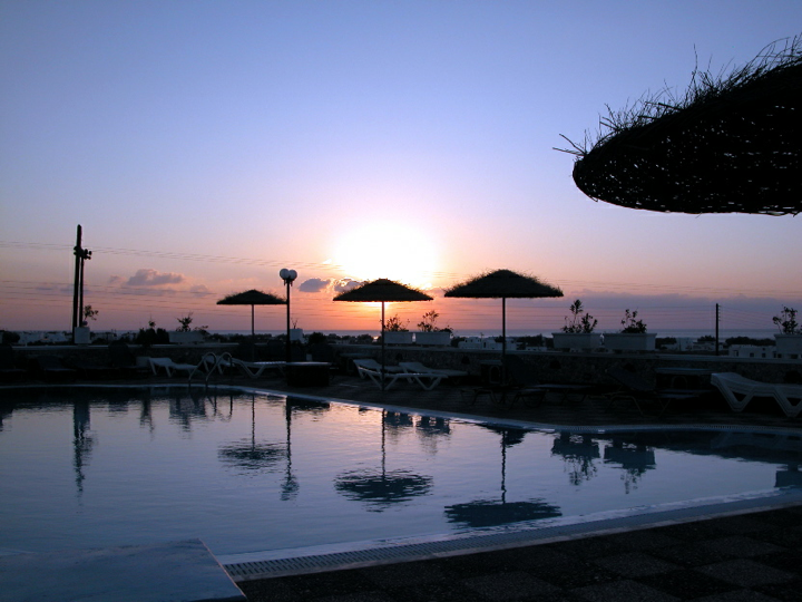 Santorini - Sun rising over Roberto's Villas swimming pool
