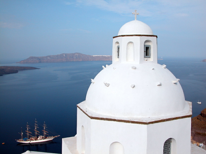 Santorini - Fyra church with Caldera view and Sea Cloud down below