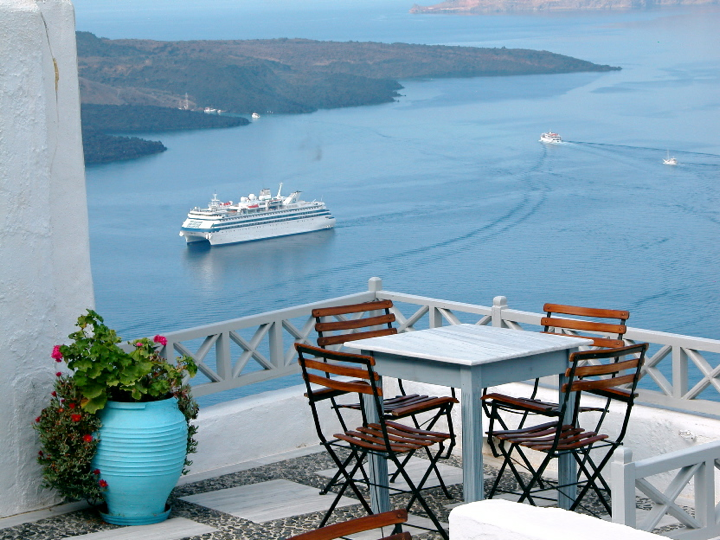 Santorini - Caldera view with Sea Cloud and cruise boat down below