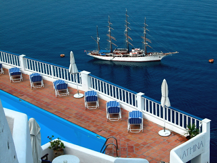 Santorini - Hotel Athina swimming pool with Caldera view and the Sea Cloud
