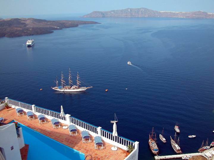 Santorini - Hotel pool overlooking Caldera and Sea Cloud