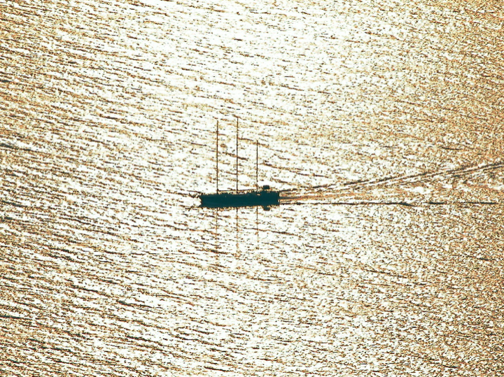 Santorini - Boat in silver sunset waters