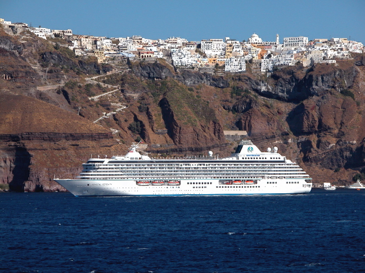 Santorini - Crystal Serenity luxury cruise ship in front of Fyra
